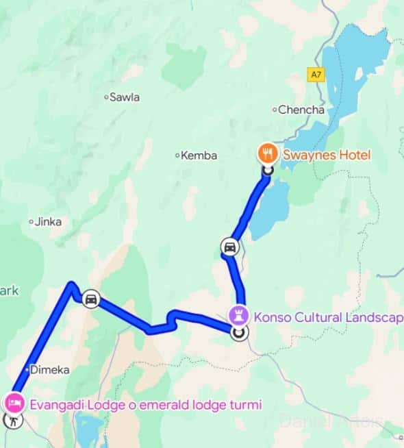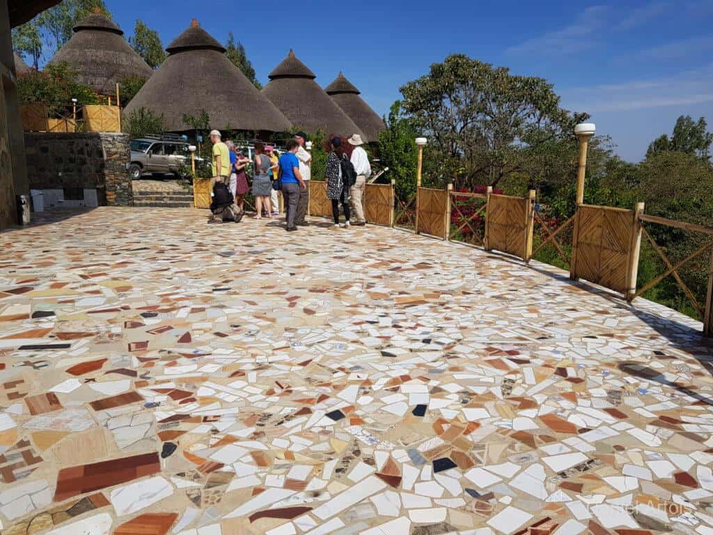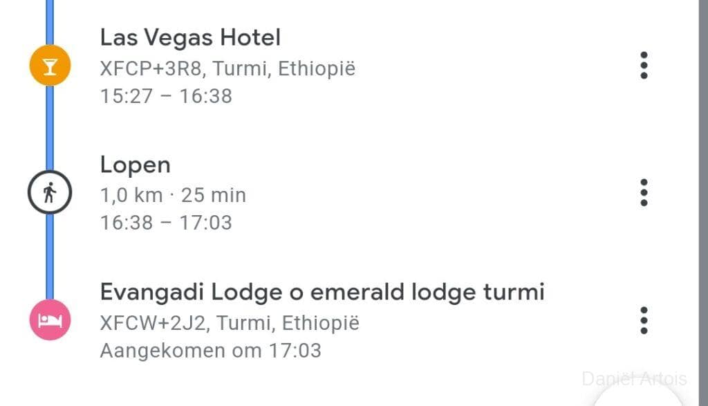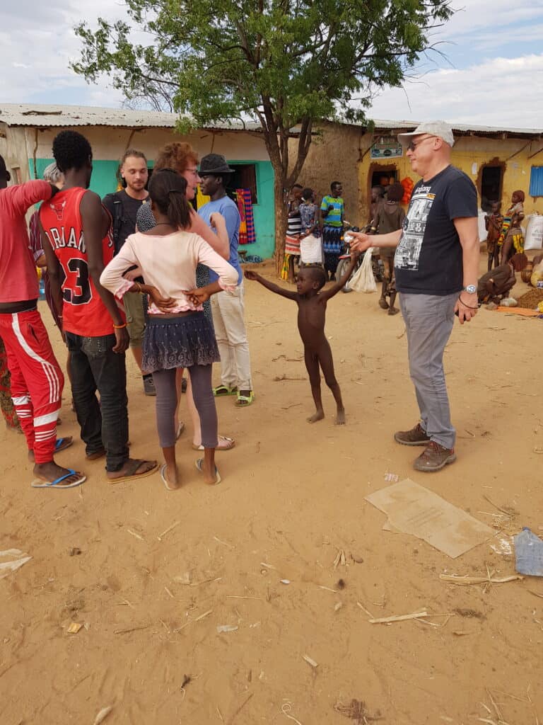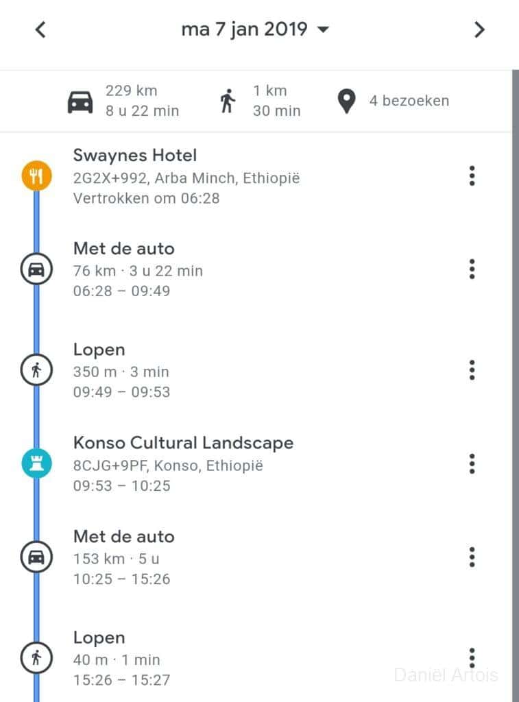 Vervolgens door naar Konso voor een koffiestop bij het hotel waar we later in de week zullen overnachten. Toen verder naar Key afar voor de lunch (in de buitenlucht). Na de lunch verder over zandwegen (wel de hele dag mooie landschappen) naar Turmi. Onderweg moest nog even een lekke band van één van de Land Cruisers verholpen worden.