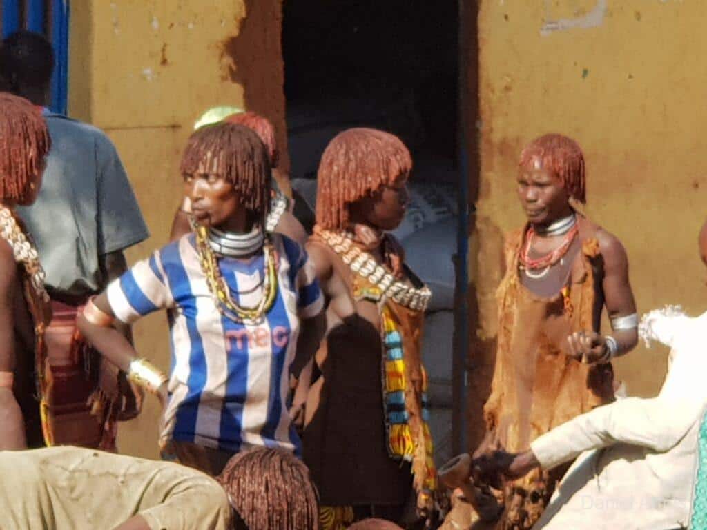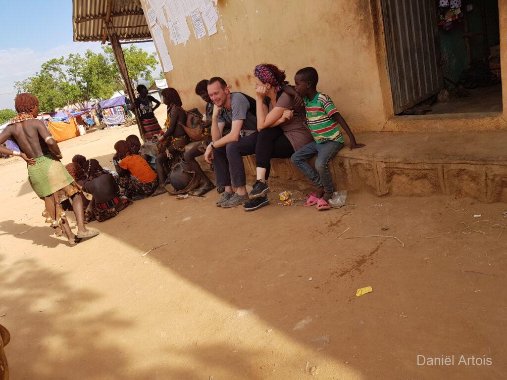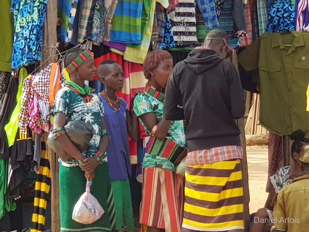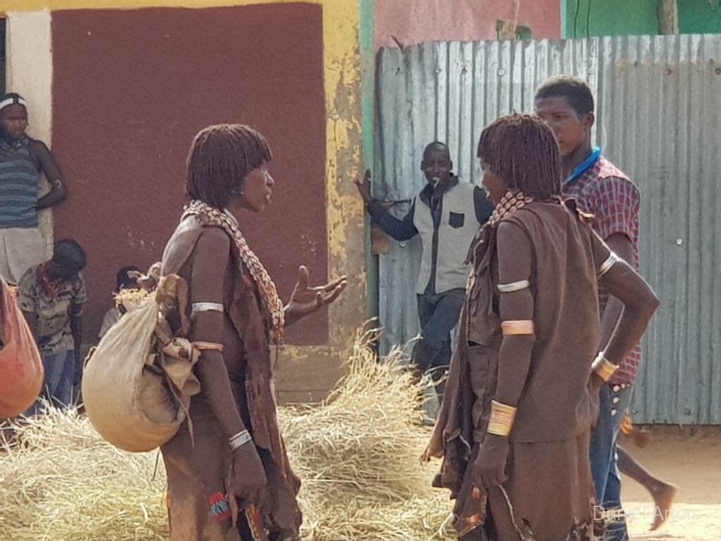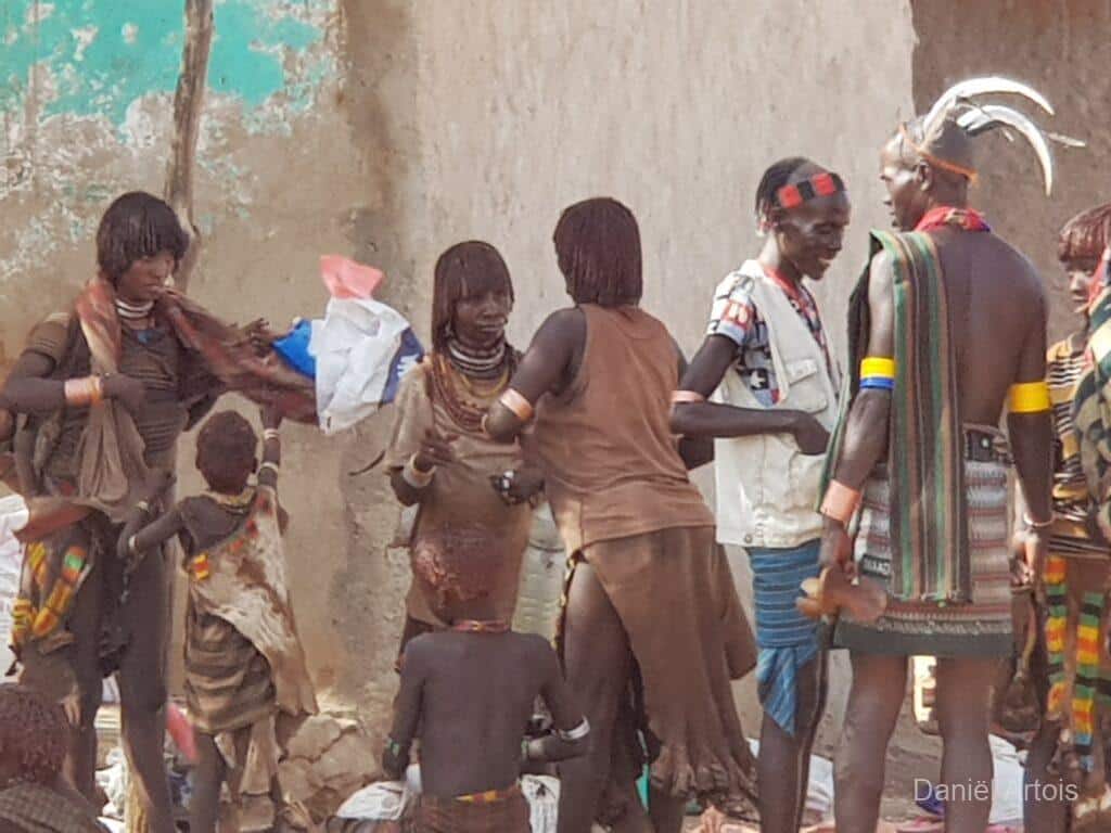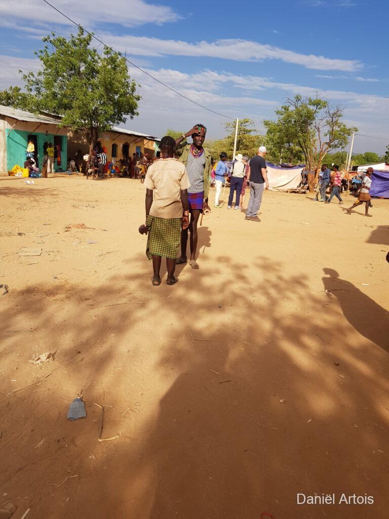 Om half vier kwamen we aan in Turmi waar we een uur lang de wekelijkse markt bezocht hebben. Een heel bijzonder spektakel omdat hier mannen en vrouwen van de diverse stammen uit de omgeving in de voor hen gebruikelijke uitdossing hun wekelijkse inkopen komen doen.