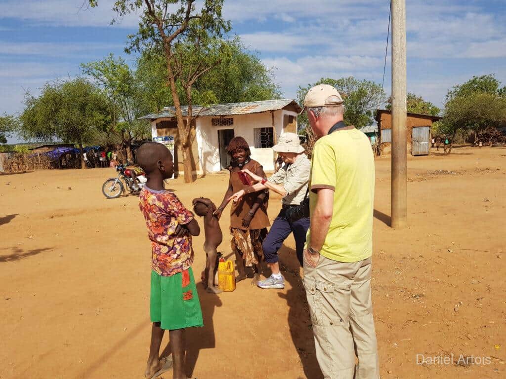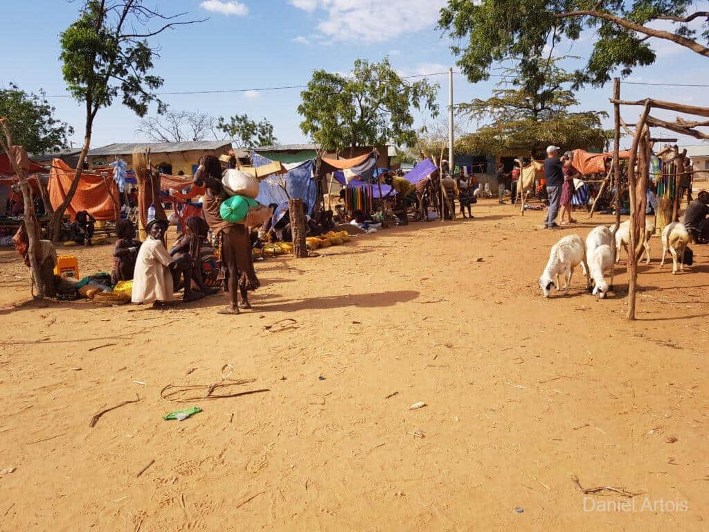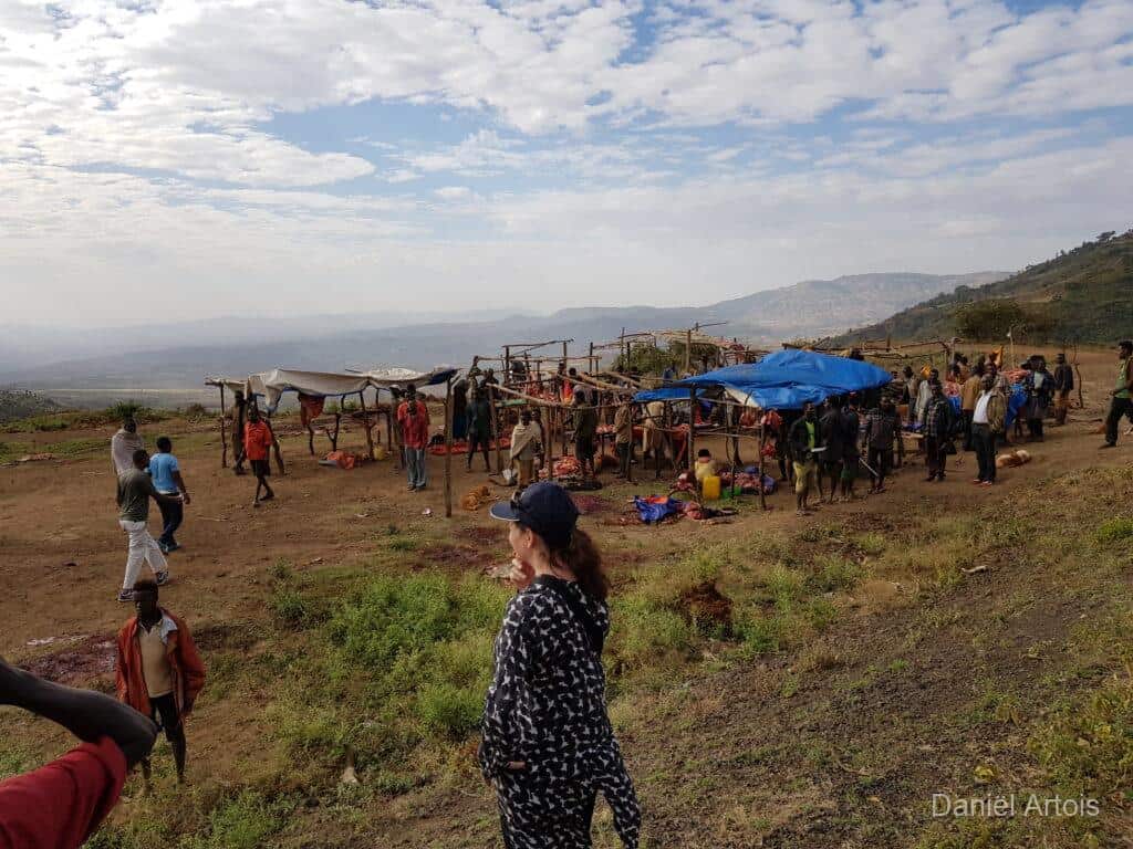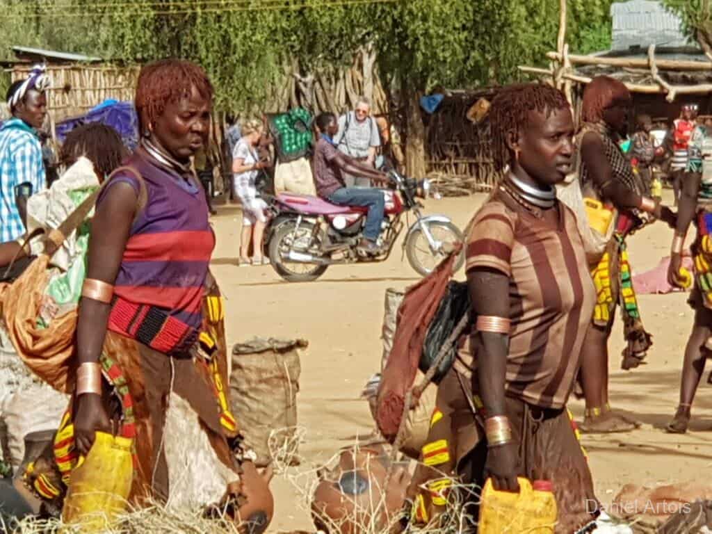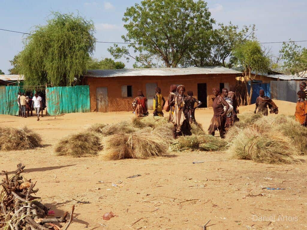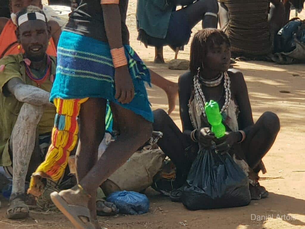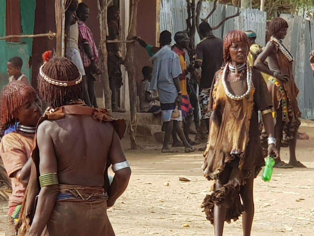 Om half vier kwamen we aan in Turmi waar we een uur lang de wekelijkse markt bezocht hebben. Een heel bijzonder spektakel omdat hier mannen en vrouwen van de diverse stammen uit de omgeving in de voor hen gebruikelijke uitdossing hun wekelijkse inkopen komen doen.