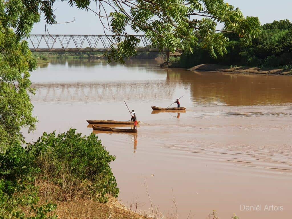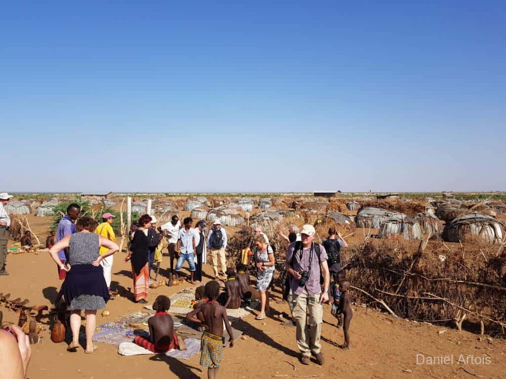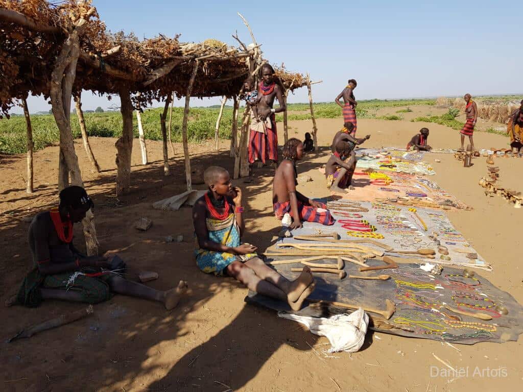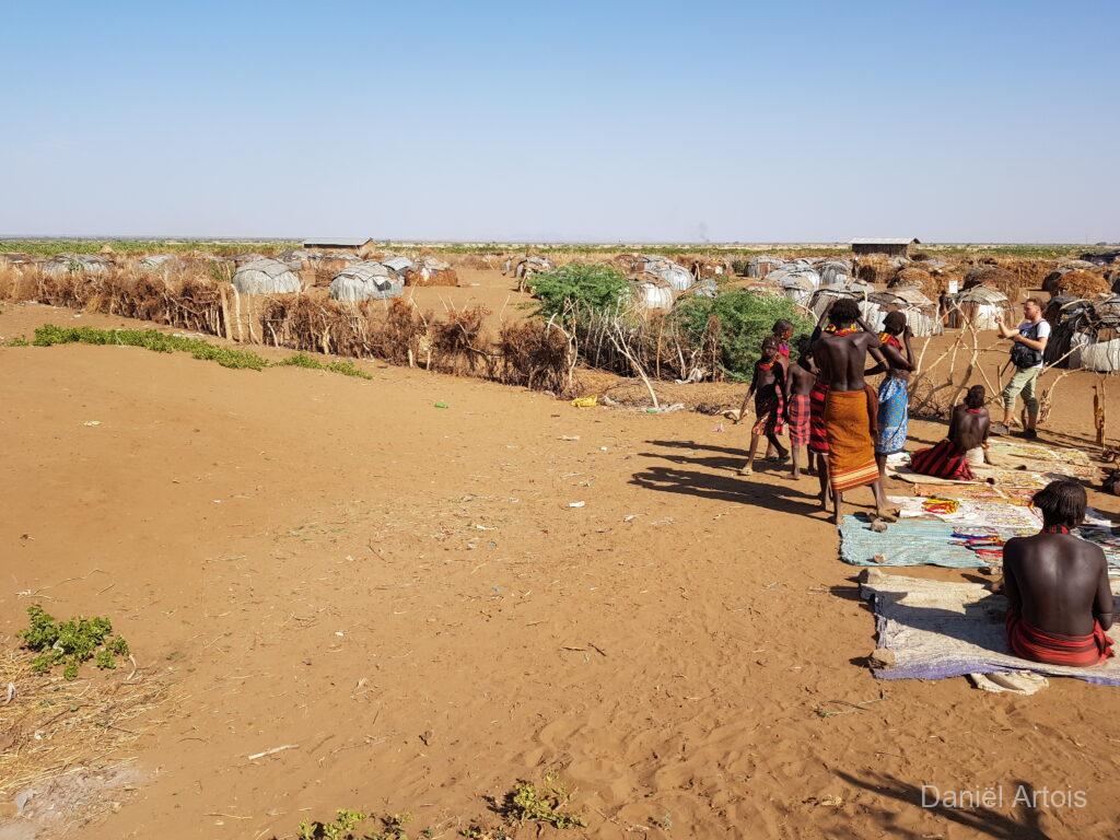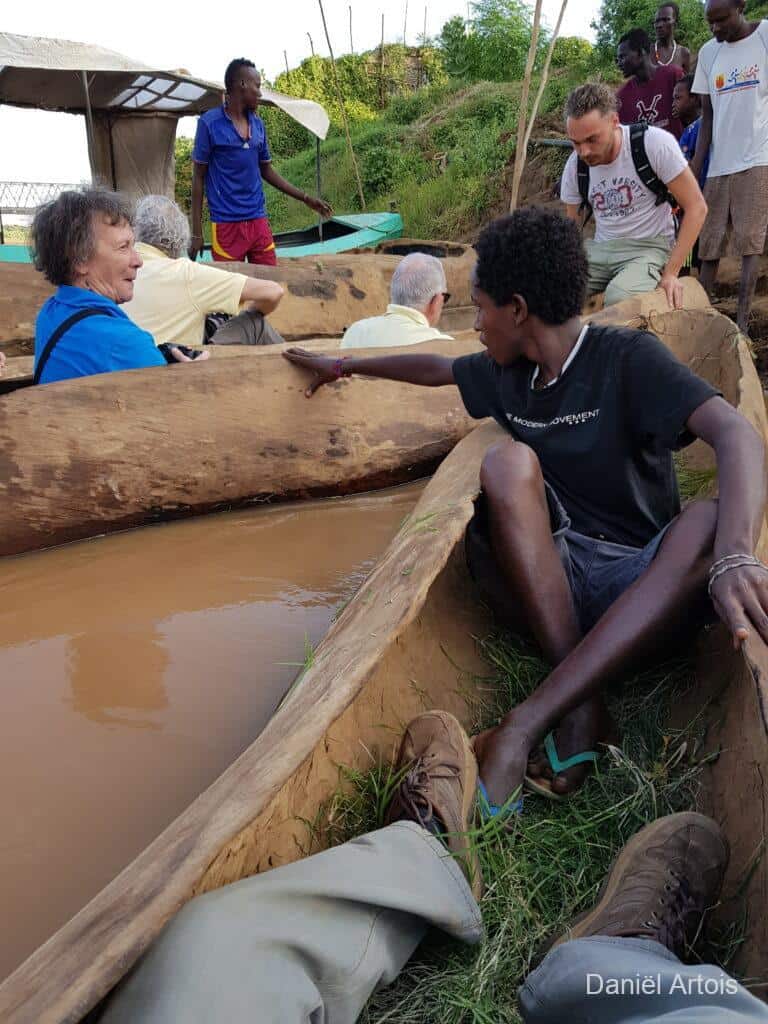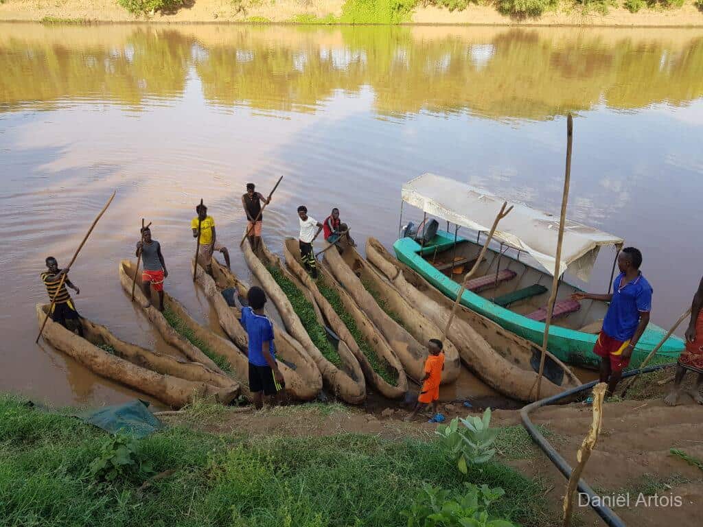 Rond acht uur kwamen we bij een grenscontrole omdat je hier op korte afstand van de Kenyaanse grens bent. Na de controle met bootjes (uitgeholde boomstammen) de rivier over naar het leefgebied van de Dassanech stam.