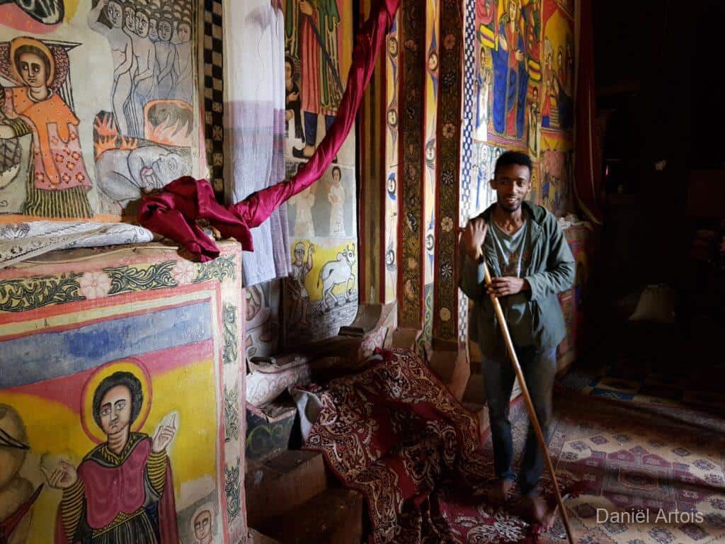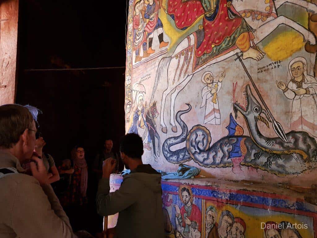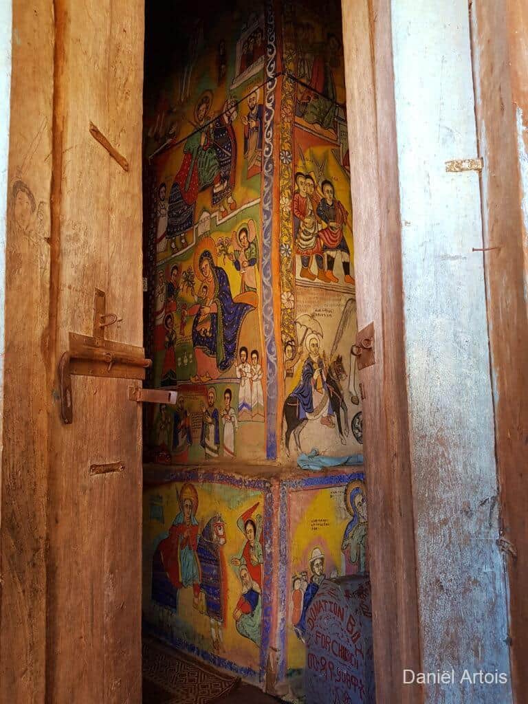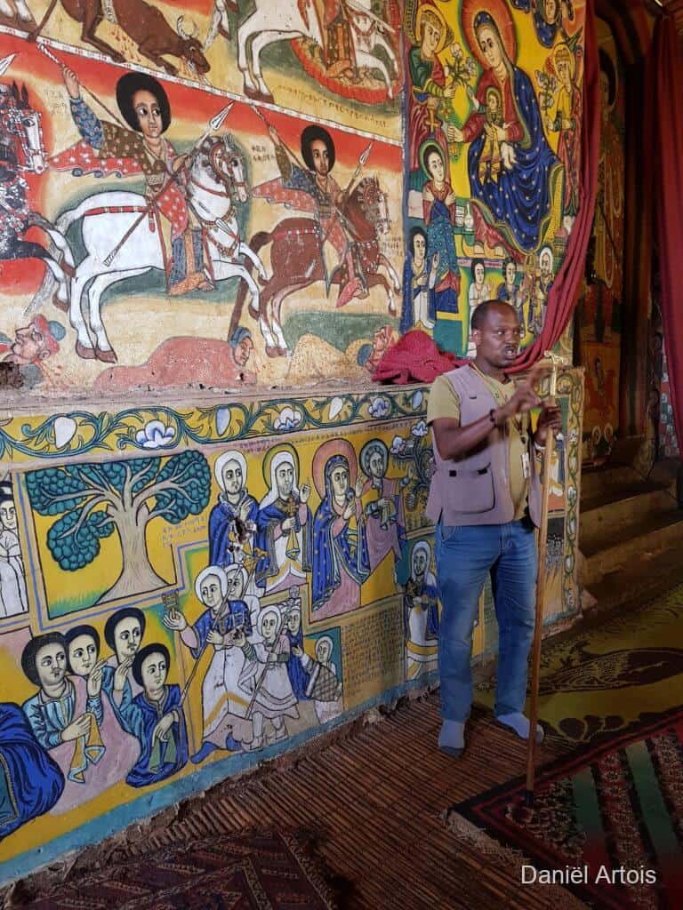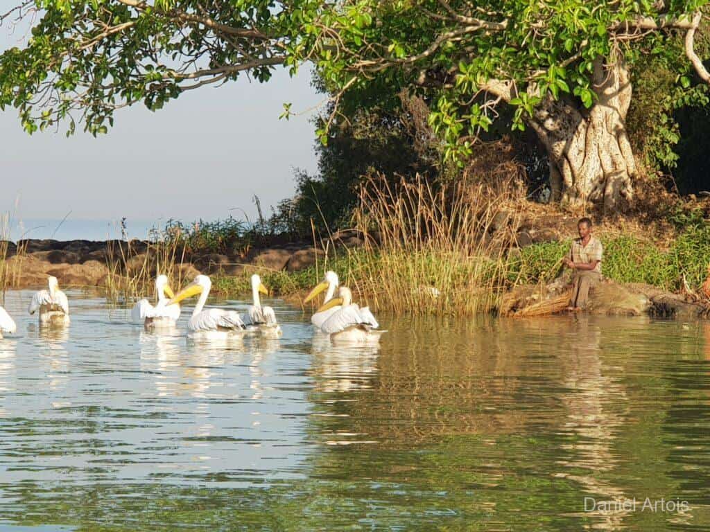 Om zeven uur ontbeten, acht uur vertrek. Voor de ochtend stond een boottocht over Lake Tana op het programma. Eerst voeren we een stukje naar de monding van de Blauwe Nijl waar we weer nijlpaarden en pelikanen gezien hebben. Toen voeren we naar een schiereiland in het meer waar we achtereenvolgens het Bete Mariam klooster en het Ura Kidanemihret klooster bezochten.
