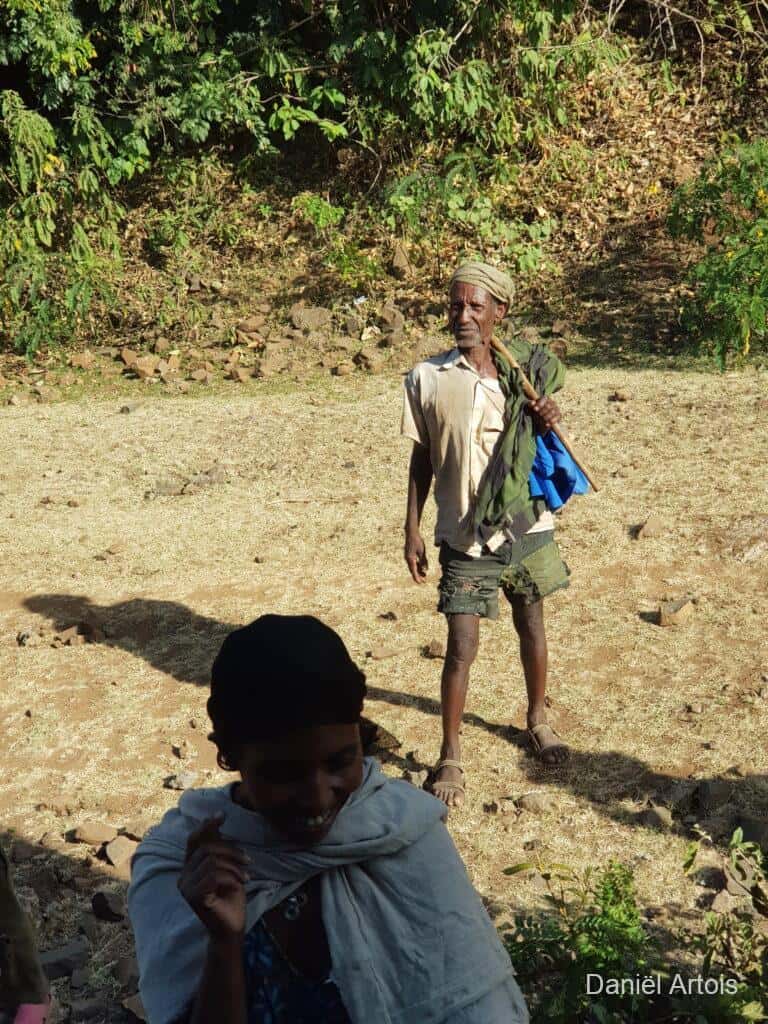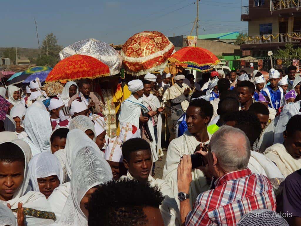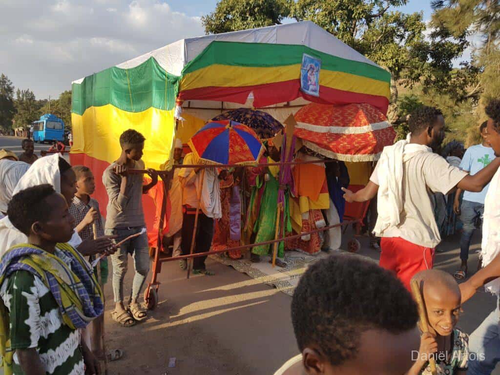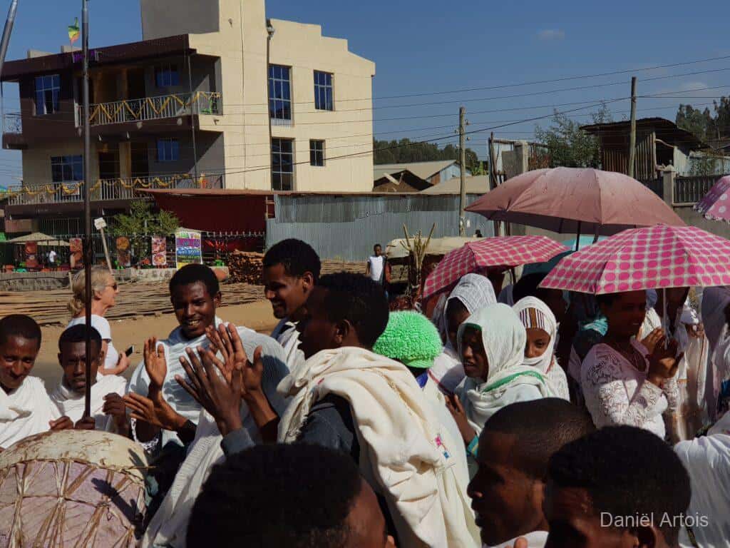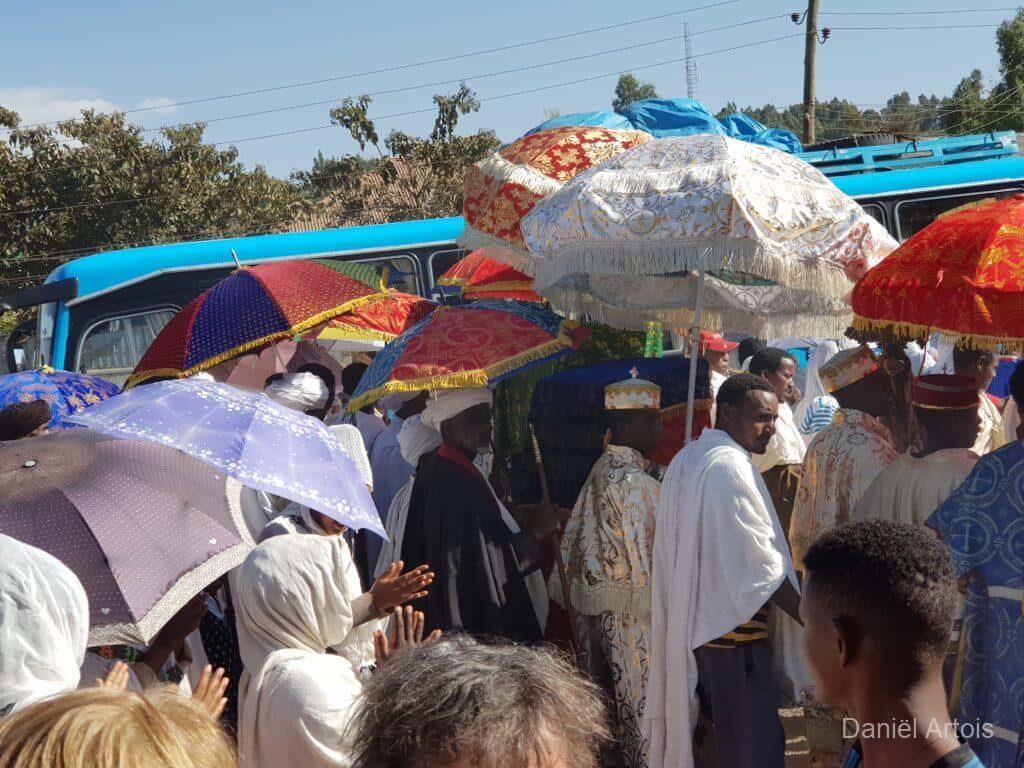 Na de bezoeken nog koffie gedronken en daarna weer met de boot terug naar ons hotel voor de lunch. Om kwart over twee op weg naar Gondor. Al vrij snel kwamen we door een plaatsje waar een ceremonie plaatsvond ter voorbereiding op het Timkat festival. Dit zou zich onderweg nog twee keer herhalen bij de plaatsen Emfriez en Maksegnit. Met ook nog enkele fotostops kwamen we om kwart over zeven aan bij ons mooie resort Mintiwab Lodge iets buiten Gondor.