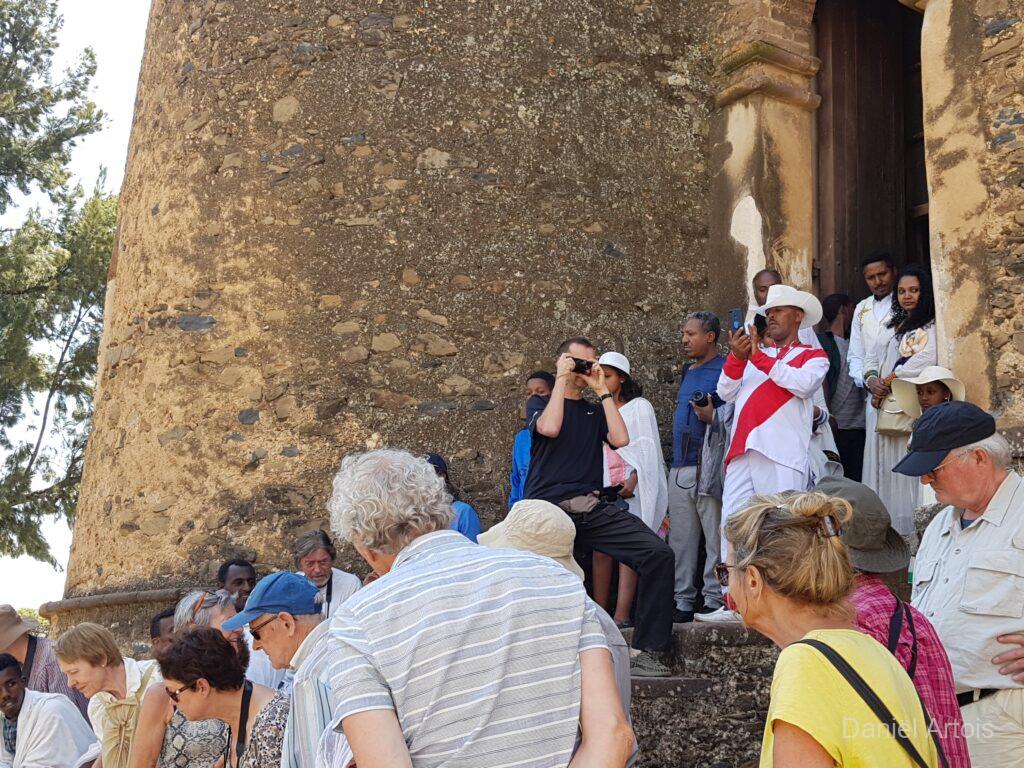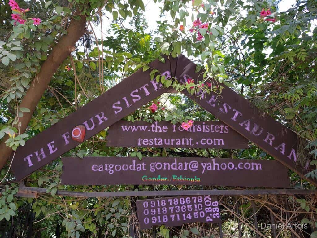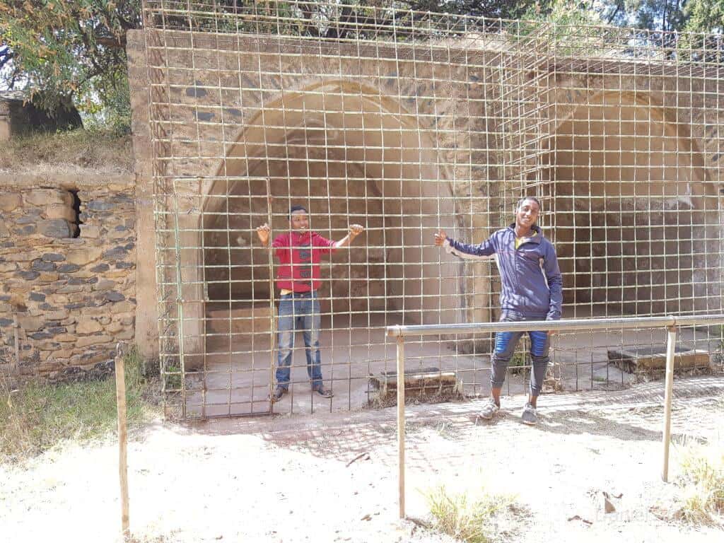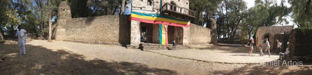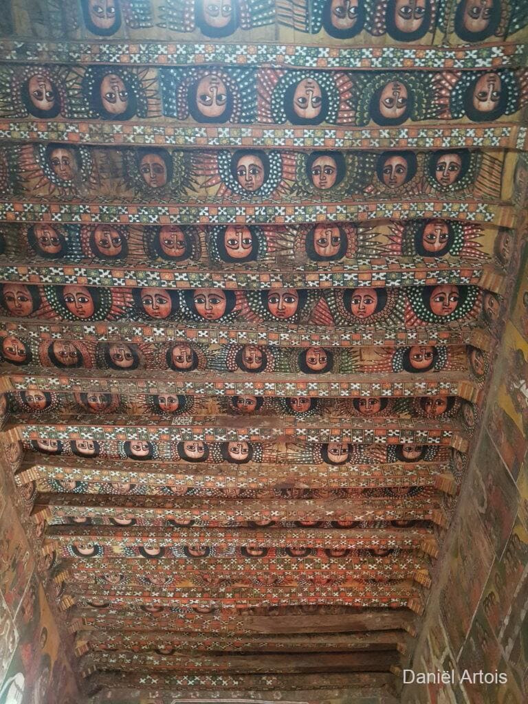 Om elf uur begonnen we aan een rondleiding door de stad. We reden eerst naar de Royal Enclosure waar we een aantal koninklijke paleizen (vanaf 1635 – ca. 1780) hebben bezocht. Veel bouwstijlen met Spaanse of Portugese invloed. Na dit bezoek gingen we lunchen bij de Three Sisters een restaurant dat hoog staat aangeschreven in de Lonely Planet. Na de lunch nog een kort bezoek gebracht aan de Debre Berkan Selassie kerk uit de 17e eeuw. Ook hier weer mooie beschilderde linnen doeken aan de wanden.