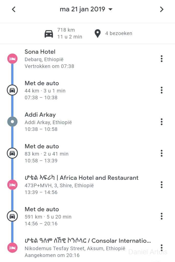 Half zeven ontbijt, half acht vertrek. Vandaag moesten we ongeveer 220 km rijden naar Axum. Het begon meteen goed want iets buiten Debark kwamen we op een door de Italianen aangelegde onverharde bergweg, die ook gebruikt is voor het programma de “Gevaarlijkste Wegen van de Wereld”. Je gaat langs steile afgronden maar wel met prachtige uitzichten. Later wordt de weg beter, maar het blijft klimmen en dalen, nog steeds door een mooi landschap. Om elf uur koffiestop in Adi Arkai, hier ook nog even rondgelopen. Op onze verdere route kamen we nog langs een kamp met vluchtelingen uit Eritrea, zeer schrijnend; en maakten we nog een fotostop bij een prachtige baobab boom. Om ongeveer twee uur hadden we een tamelijk luxe lunch bij het Africa hotel in Shire. Hiervandaan was het nog anderhalf uur rijden naar ons beste hotel tot nu toe, Hotel Consular in Axum. Aan het eind van de middag even naar het centrum van Axum gelopen. s’Avonds in het hotel gegeten. Erg lekker.
