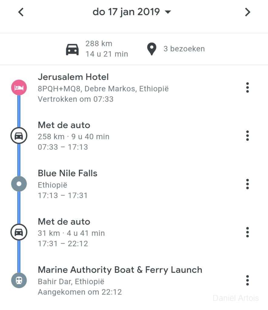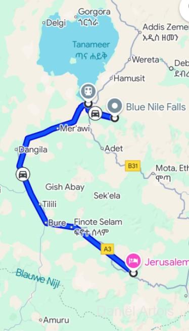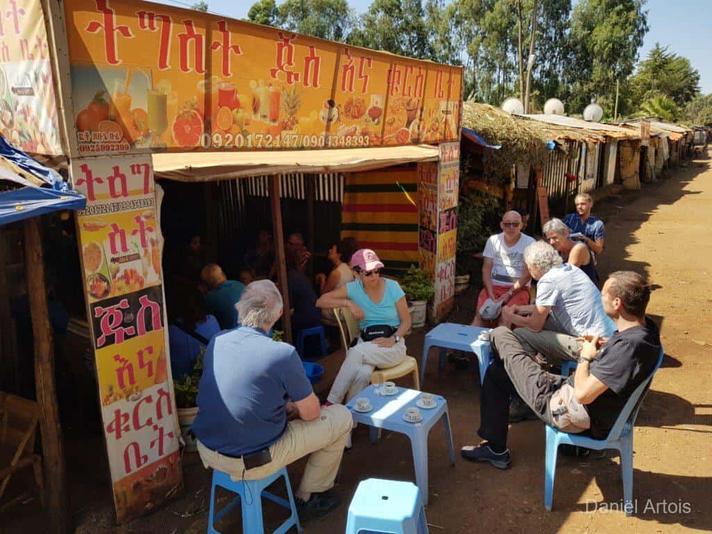 Om zeven uur ontbijt, acht uur vertrek met de bus richting Bahir Dar. Op weg naar de koffiestop nog een wandeling gemaakt langs de weg door een dorpje dichtbij Jina. Koffiestop bij een leuk lokaal restaurantje iets voor het plaatsje Burie. Heerlijke koffie inclusief koffie ceremonie.