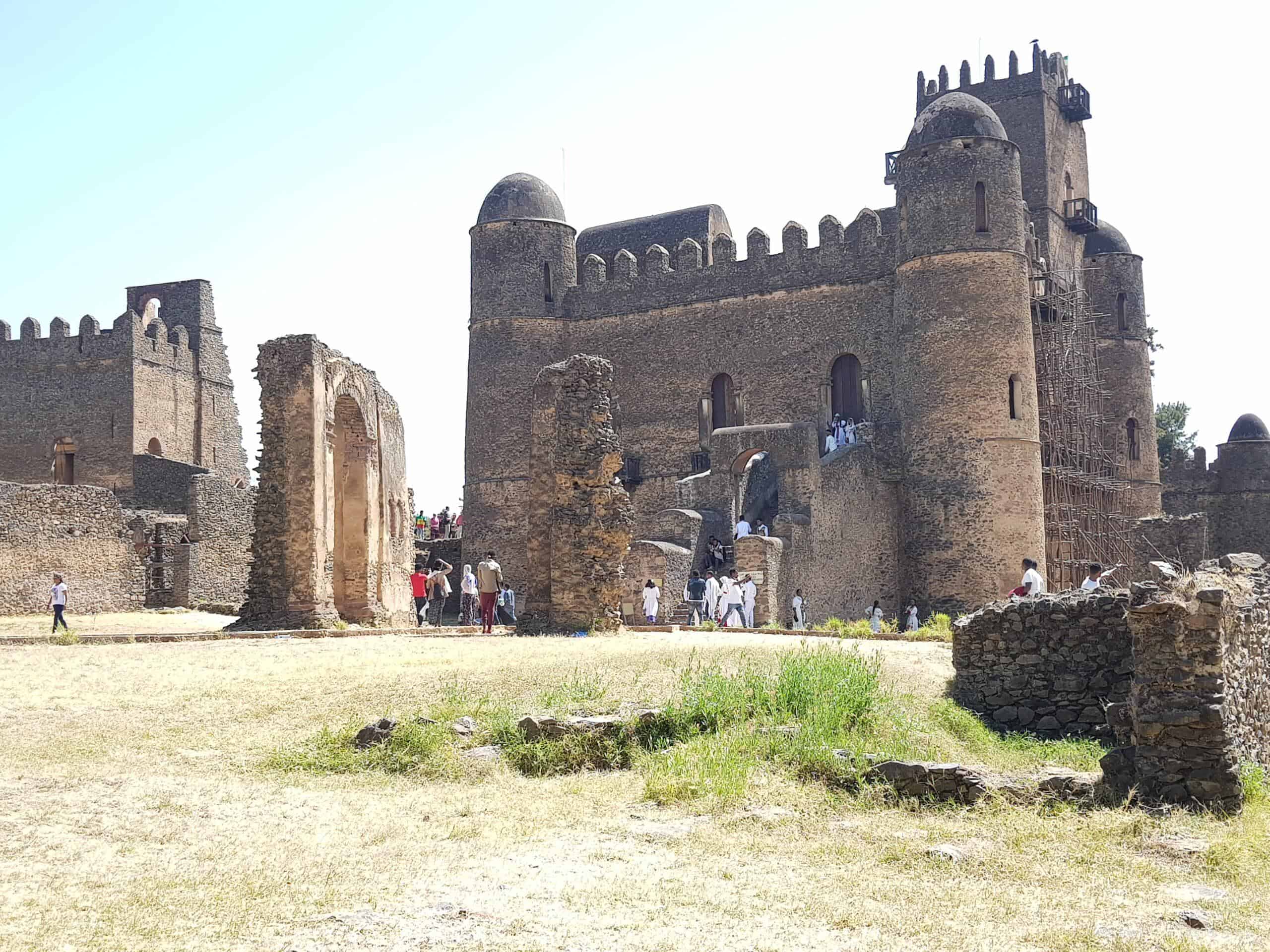 Om elf uur begonnen we aan een rondleiding door de stad. We reden eerst naar de Royal Enclosure waar we een aantal koninklijke paleizen (vanaf 1635 – ca. 1780) hebben bezocht. Veel bouwstijlen met Spaanse of Portugese invloed. Na dit bezoek gingen we lunchen bij de Three Sisters een restaurant dat hoog staat aangeschreven in de Lonely Planet. Na de lunch nog een kort bezoek gebracht aan de Debre Berkan Selassie kerk uit de 17e eeuw. Ook hier weer mooie beschilderde linnen doeken aan de wanden.